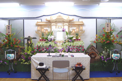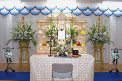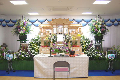 白木祭壇の両側には白い菊や洋花などの色花を彩り、そして造園を組み入れさせていただきました。式場は各方面に提携式場がございます。式場の手配や場所等につきましては、ご遠慮なくスタッフにご相談ください。 |